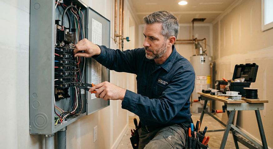 Electricians use the ShiftFlow mobile app to clock in and out. The app captures their GPS location at the moment of clock-in, ensuring they are physically present at the designated job site.